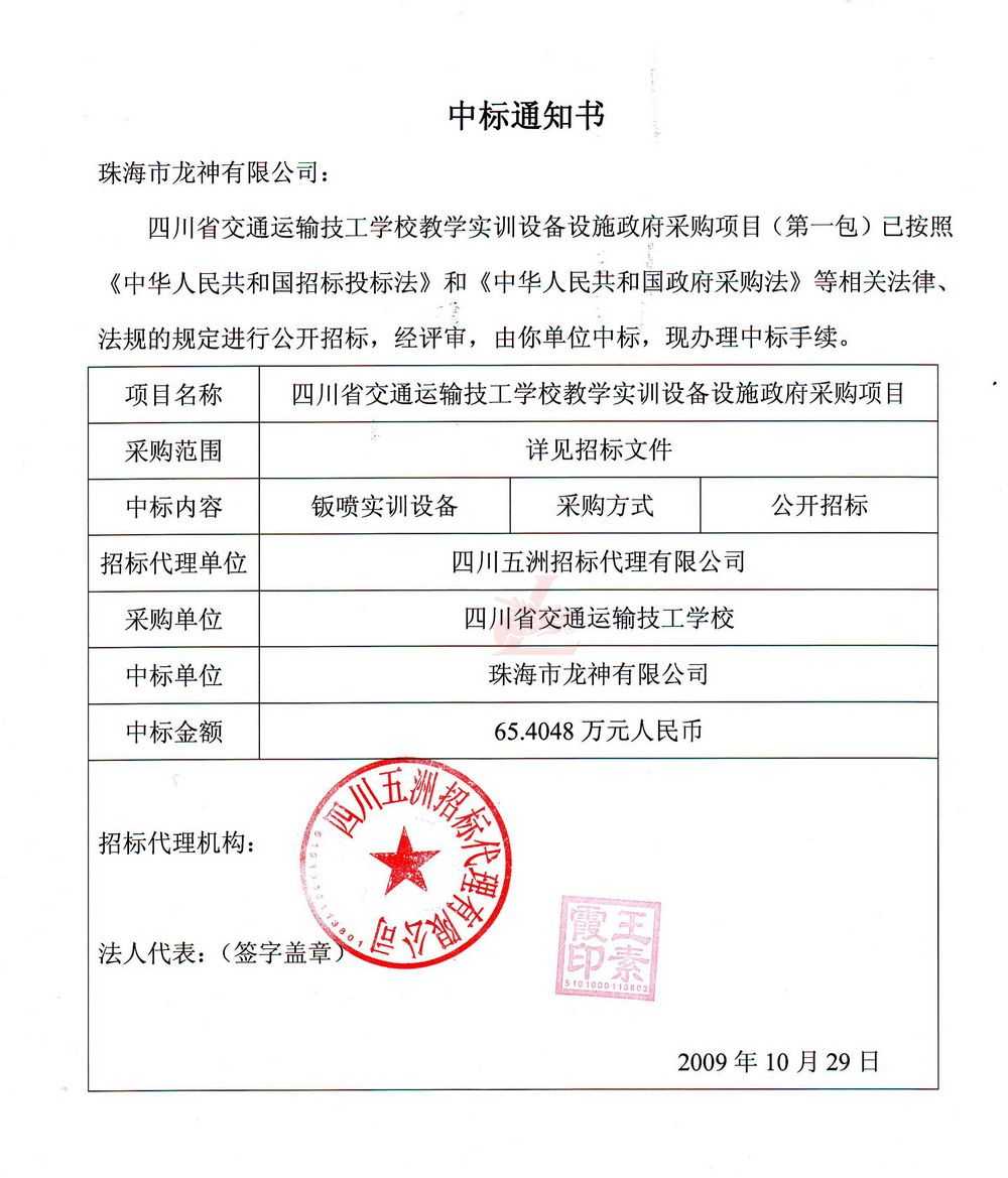 [新聞中心]珠海市龍神有限公司經(jīng)過長時間的籌備已成功中得四川省交通運輸技工學(xué)校教學(xué)實訓(xùn)設(shè)備設(shè)施政府采購項目標(biāo),這是珠海市龍神有限公司一種實力的表現(xiàn)。說明了珠海龍神的品牌在不斷的加強(qiáng)、深化。